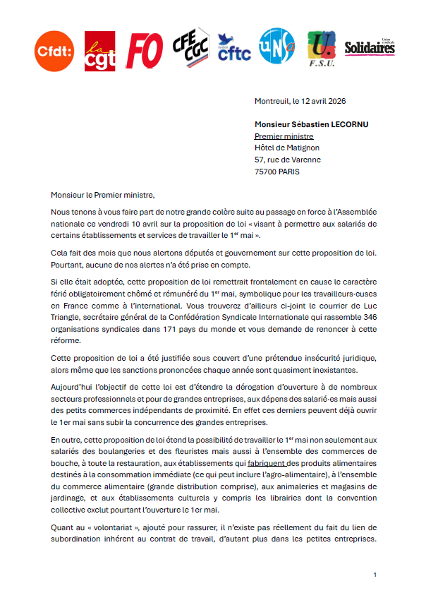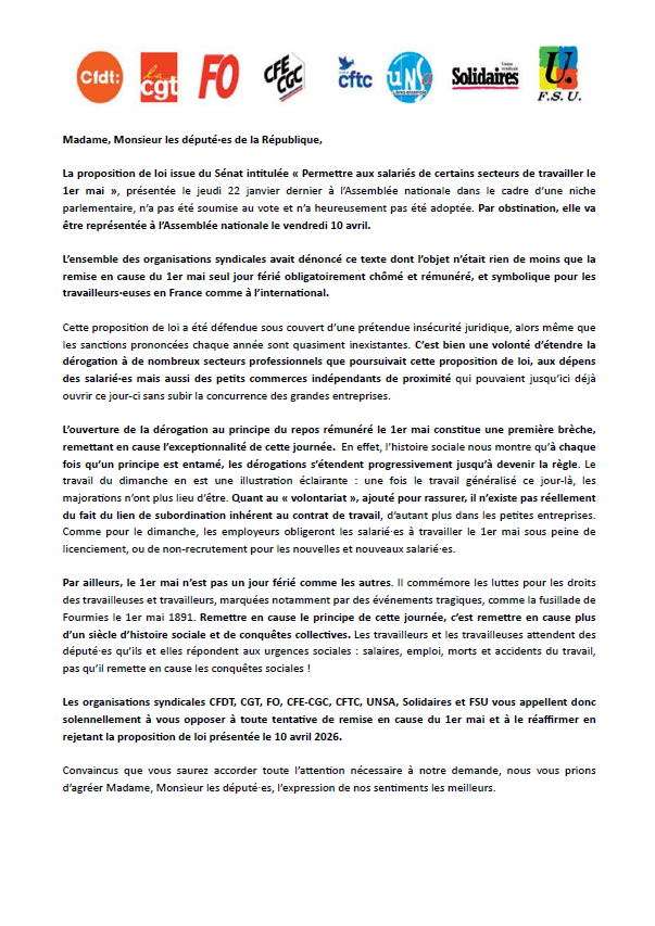 Si elle était adoptée, cette proposition de loi remettrait frontalement en cause le caractère férié obligatoirement chômé et rémunéré du 1er mai, symbolique pour les travailleurs·euses en France comme à l’international. Vous trouverez d’ailleurs ci-joint le courrier de Luc Triangle, secrétaire général de la Confédération Syndicale Internationale qui rassemble 346 organisations syndicales dans 171 pays du monde et vous demande de renoncer à cette réforme.